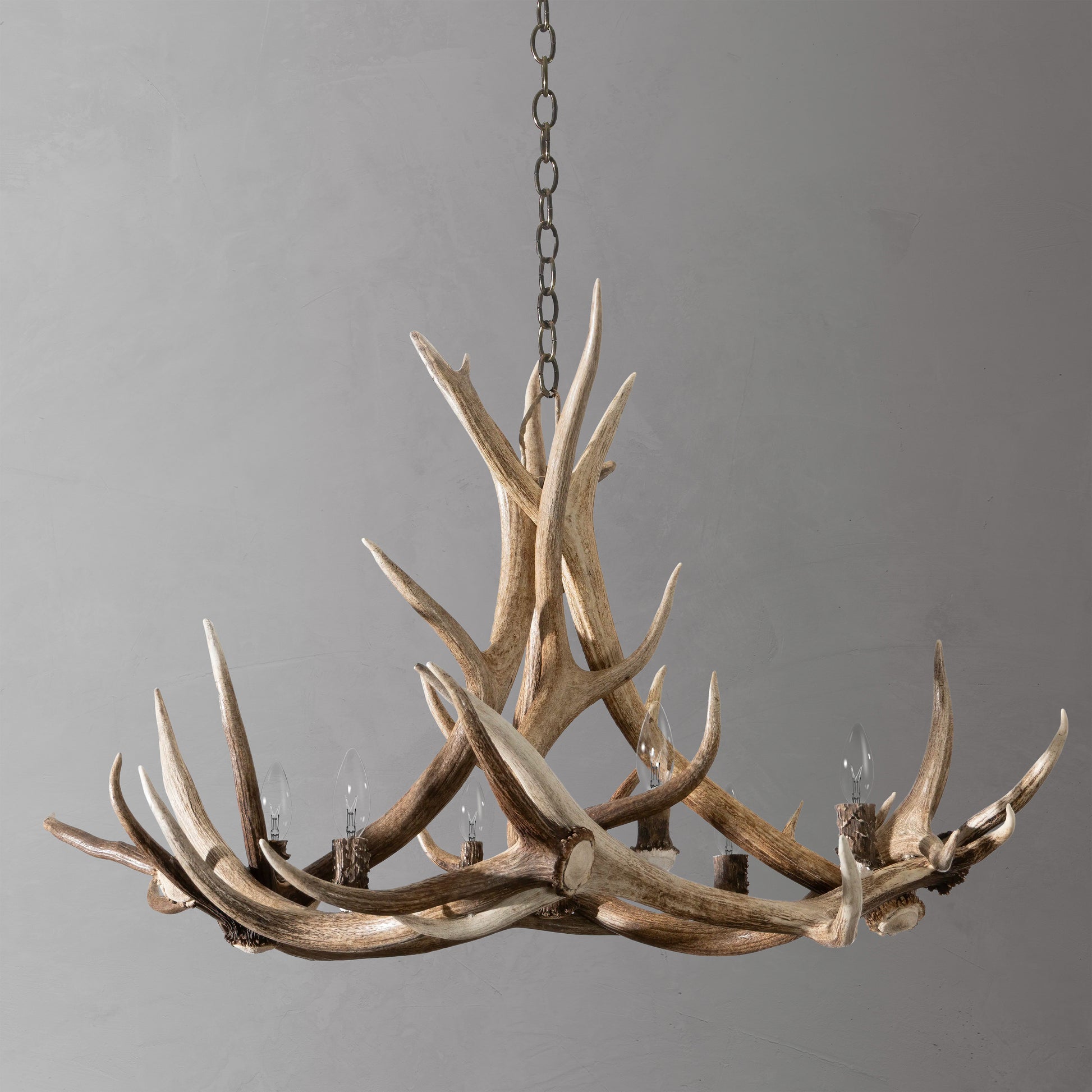 Featuring the same mountain-inspired design as our larger versions, the Small Teton Antler Chandelier is meticulously crafted with an open halo base supporting six candelabra lights. Large elk antlers rise up from the base to form a beautiful peak and complete the design.